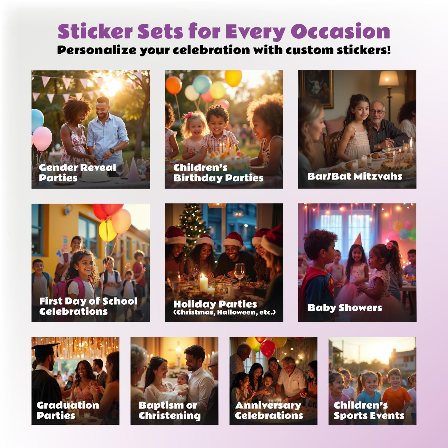 Muutke oma lapse sünnipäevapidu selle isikupärase kleebiste komplektiga unustamatuks! See komplekt, mis on loodud igale pidustusele maagilise ja kohandatud hõngu lisamiseks, sisaldab kõike, mida vajate oma peoruumi muutmiseks ainulaadsete temaatiliste siltidega. Emad saavad iga kleebise isikupärastada lapse nime, vanuse või kohandatud sõnumiga või jätta need soovi korral isegi tühjaks!