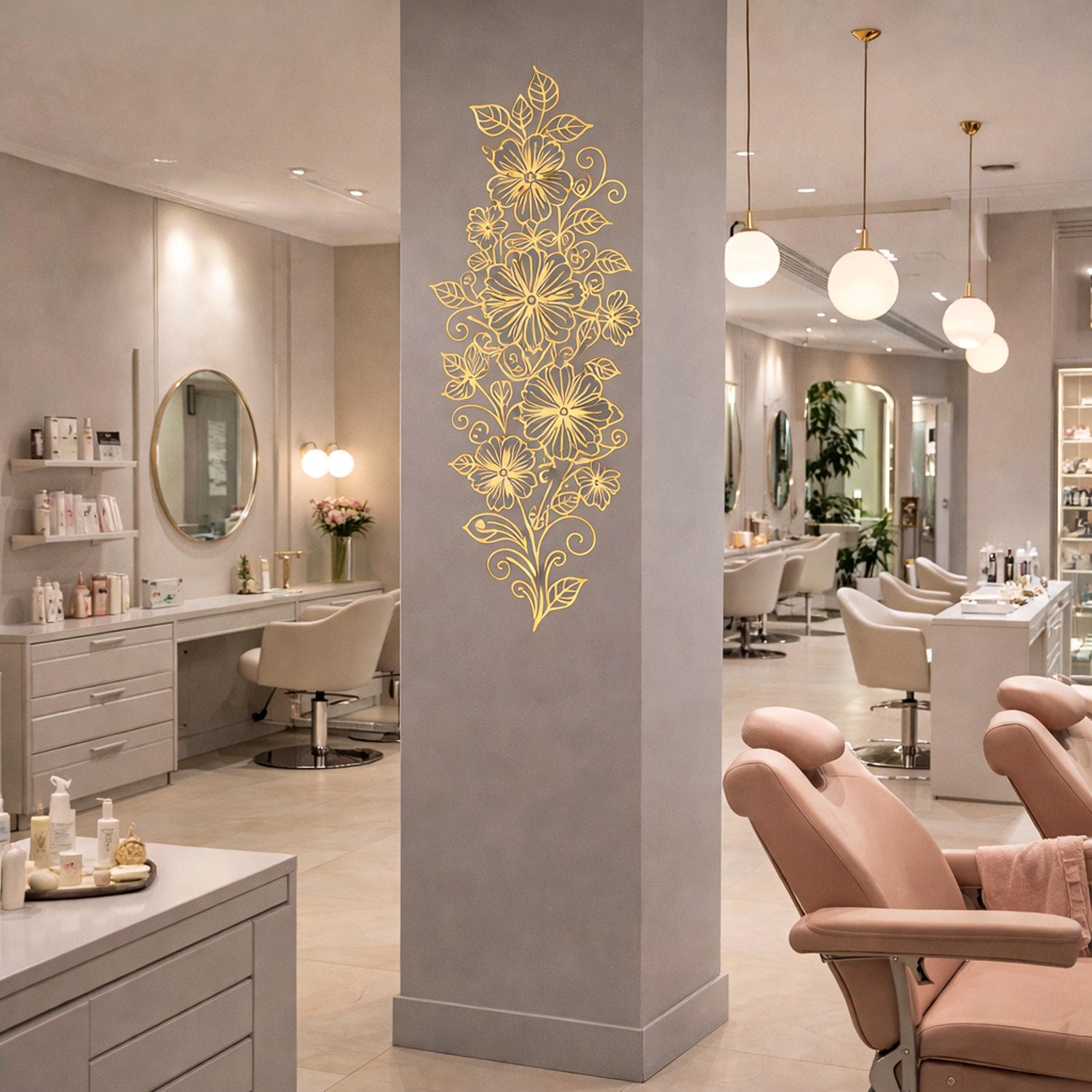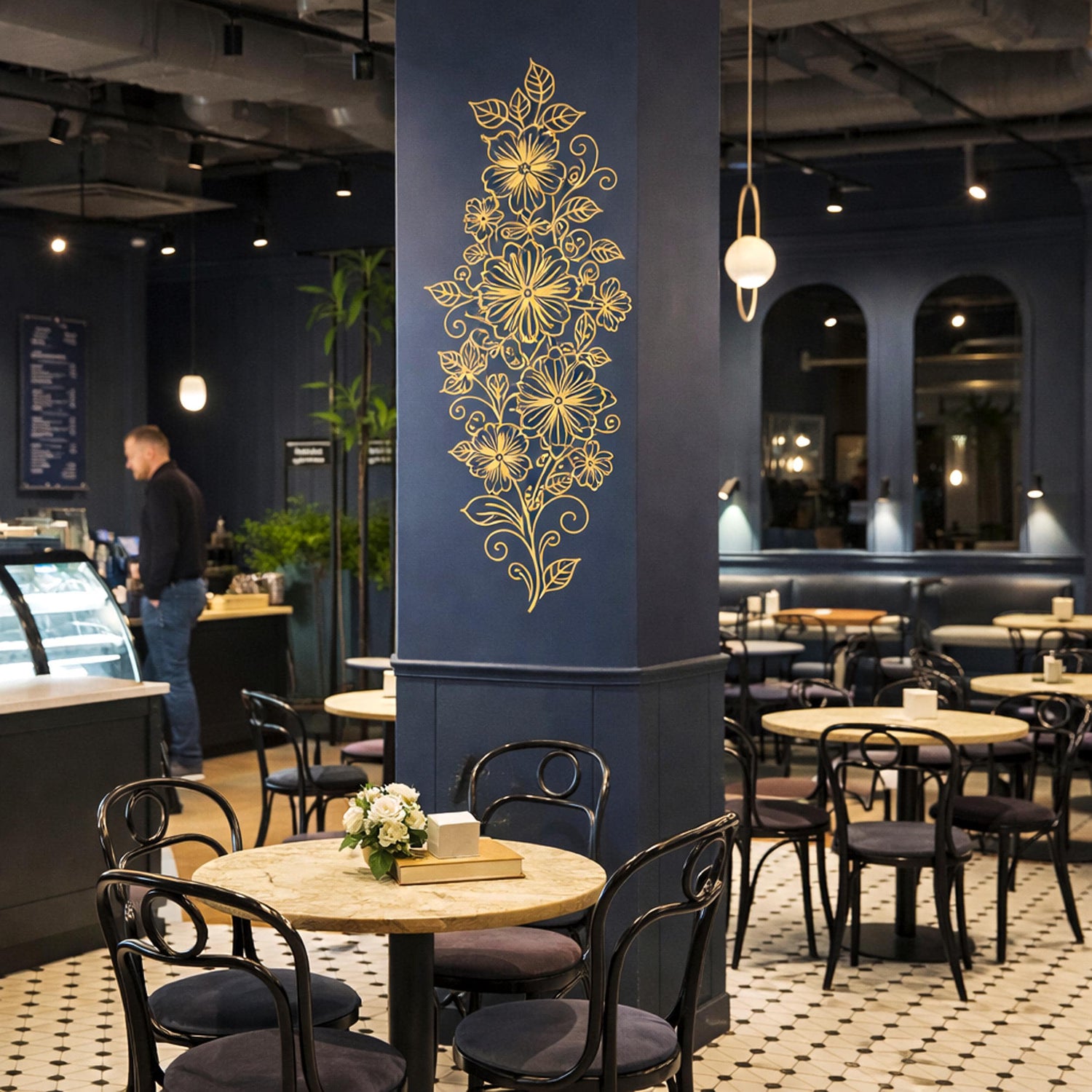 Add a touch of slender elegance to your narrow spaces. This vertical golden floral illustration features intricate line work that flows upward, making it the perfect choice for decorating door frames, thin wall sections, or pillars. Its minimalist style and luxurious gold tone offer a sophisticated "boutique" feel to any modern or bohemian interior.