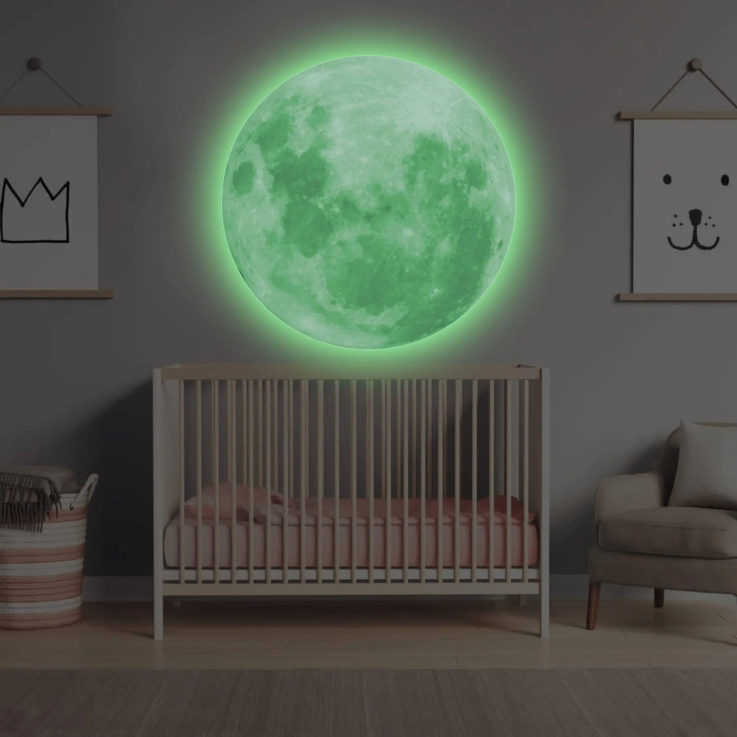 Luminous lunar wall decal illuminating a nursery with glow-in-the-dark moon design, perfect for a child's room.