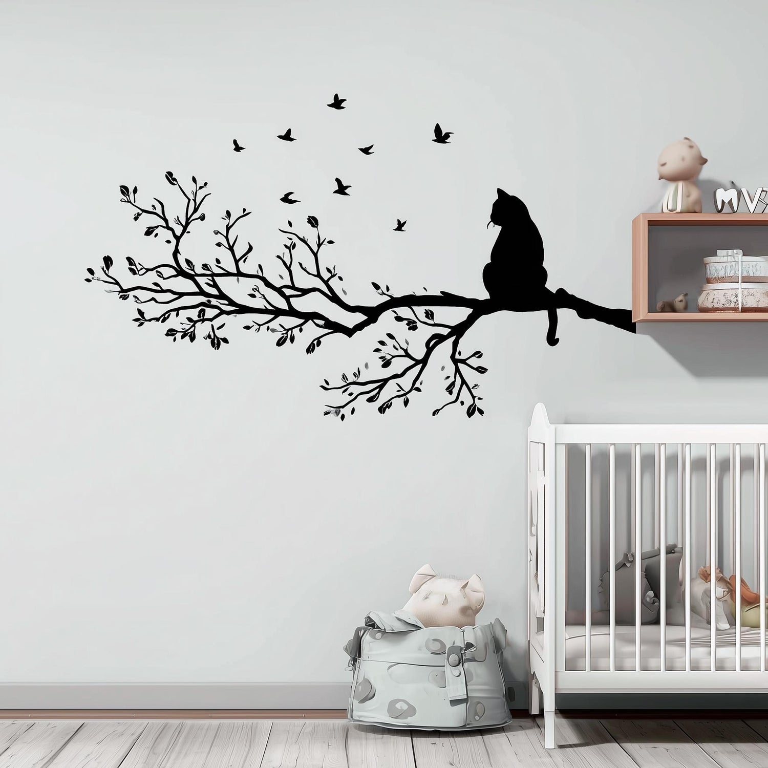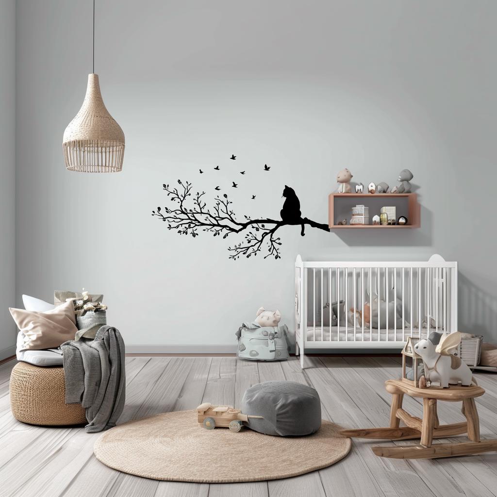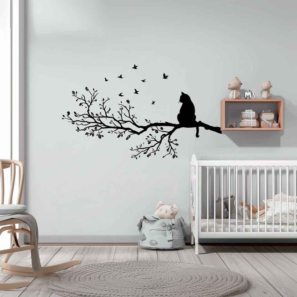 Vinyl wall decal of a cat sitting on a detailed tree branch with flying birds. The decal is solid black with no background and is applied above a crib in a soft-toned nursery.
