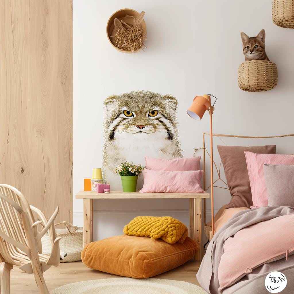 Pallas kassi seinakleebis | Manuli lastetoa vinüülkleebis | Illustreeritud loomateemaline seinakunst | Armas metskassi kaunistus | Pehme metsloomateemaline seinapilt lastetuppa