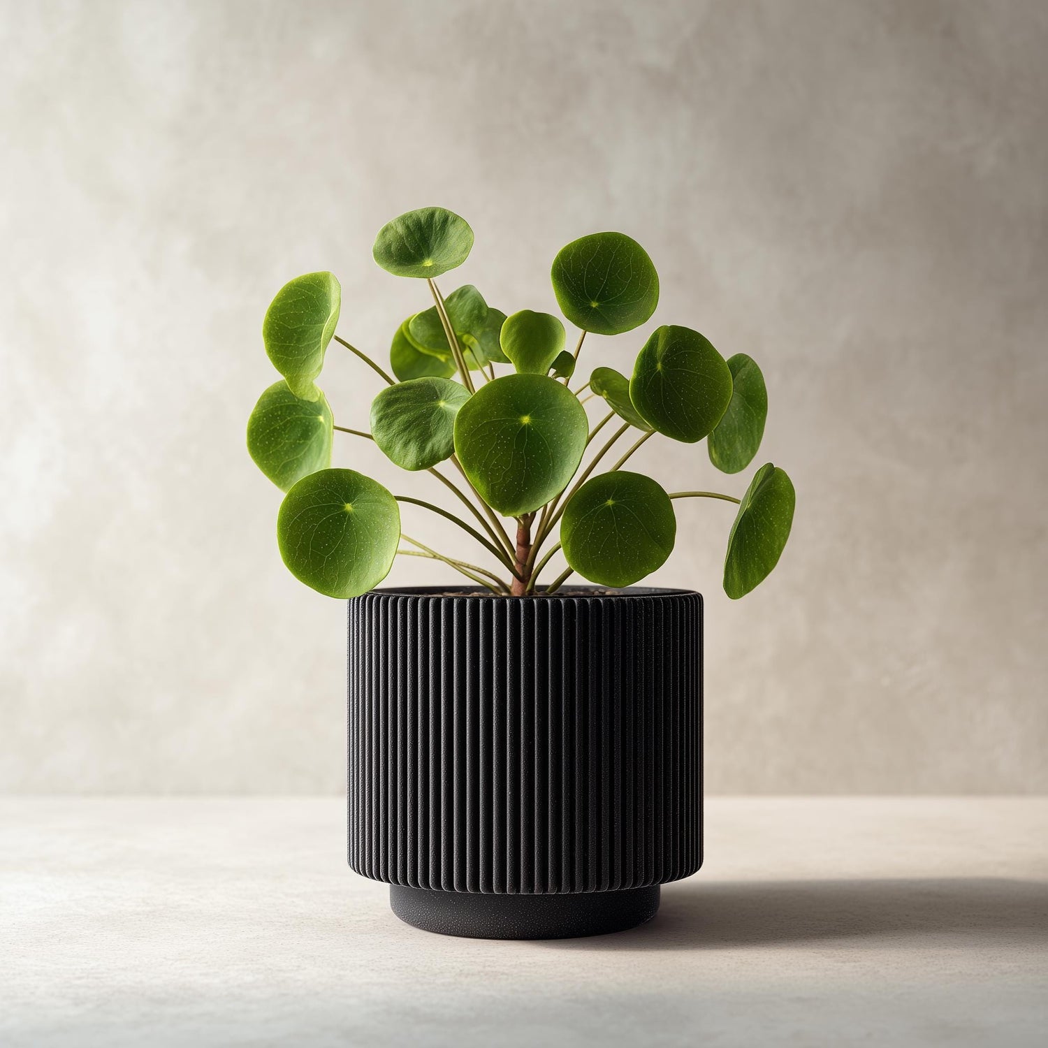 Black cylindrical 3D printed planter with vertical ribbed grooves, shown with a green indoor plant for illustration; plant not included.