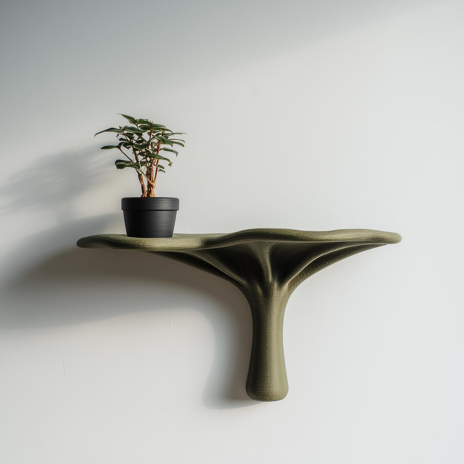 Üks seinale paigaldatav 3D-prinditud orgaaniline skulpturaalne riiul. Fotodel näidatud taim ja pott on ainult stiliseerimiseks ja ei kuulu komplekti. Paigaldustarvikud ei kuulu komplekti; palun kasutage oma seinatüübile sobivaid kinnitusi.