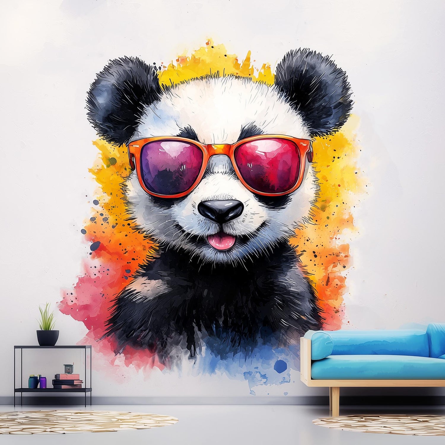 Entzückender Wandaufkleber mit Pandababy und Sonnenbrille | Bunter Aquarell-Spritzer-Aufkleber für Babybären | Niedliche Wandaufkleber mit Tieren
