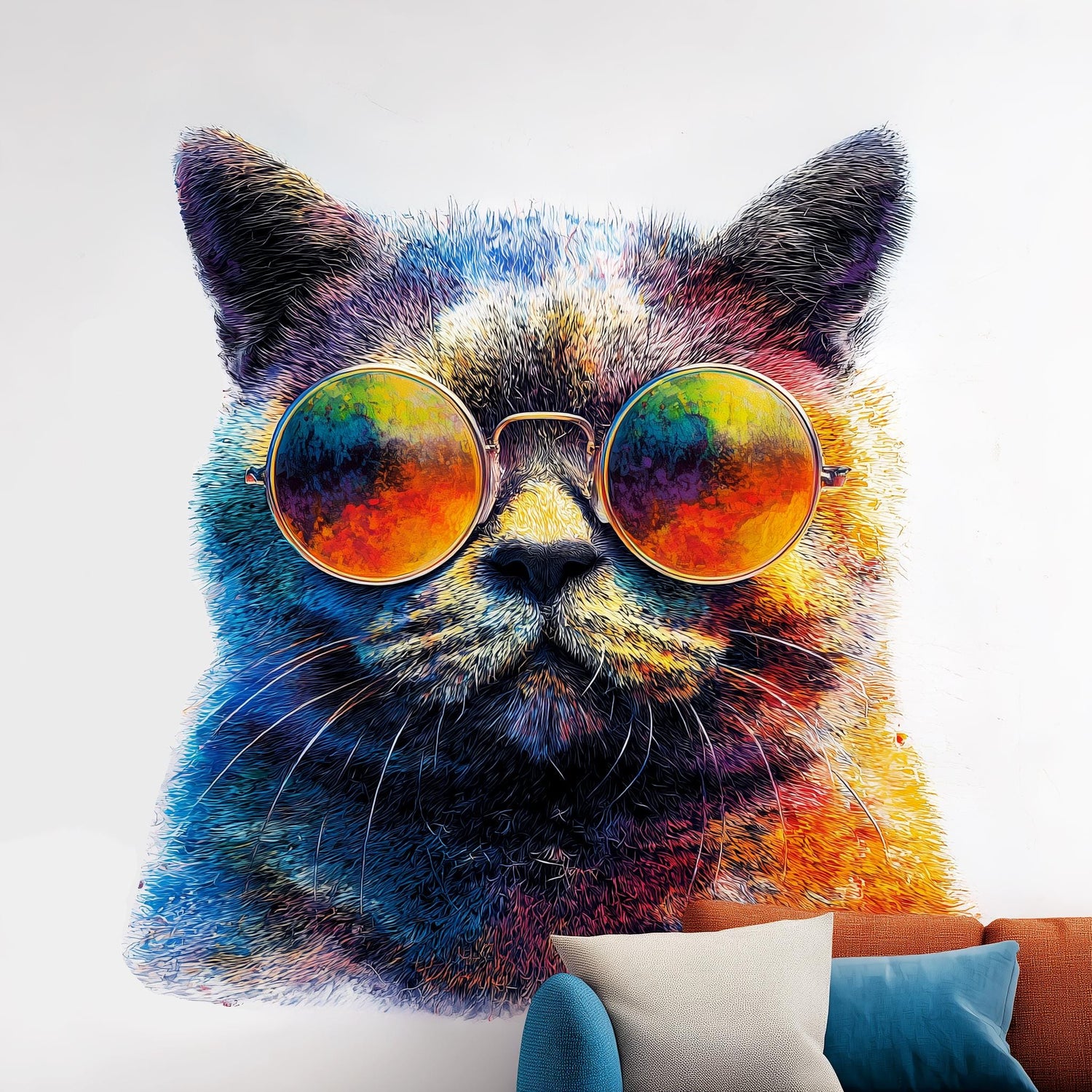 See erksavärviline seinakleebis kujutab enesekindlat kassi erksates päikeseprillides, mis on trükitud täisvärvides, et tuua teie ruumi elu ja energiat. Olenemata sellest, kas sisustate teismelise magamistuba, loomingulist stuudiot või omapärast esikut, annab see pilkupüüdev disain julge ja moodsa avalduse.