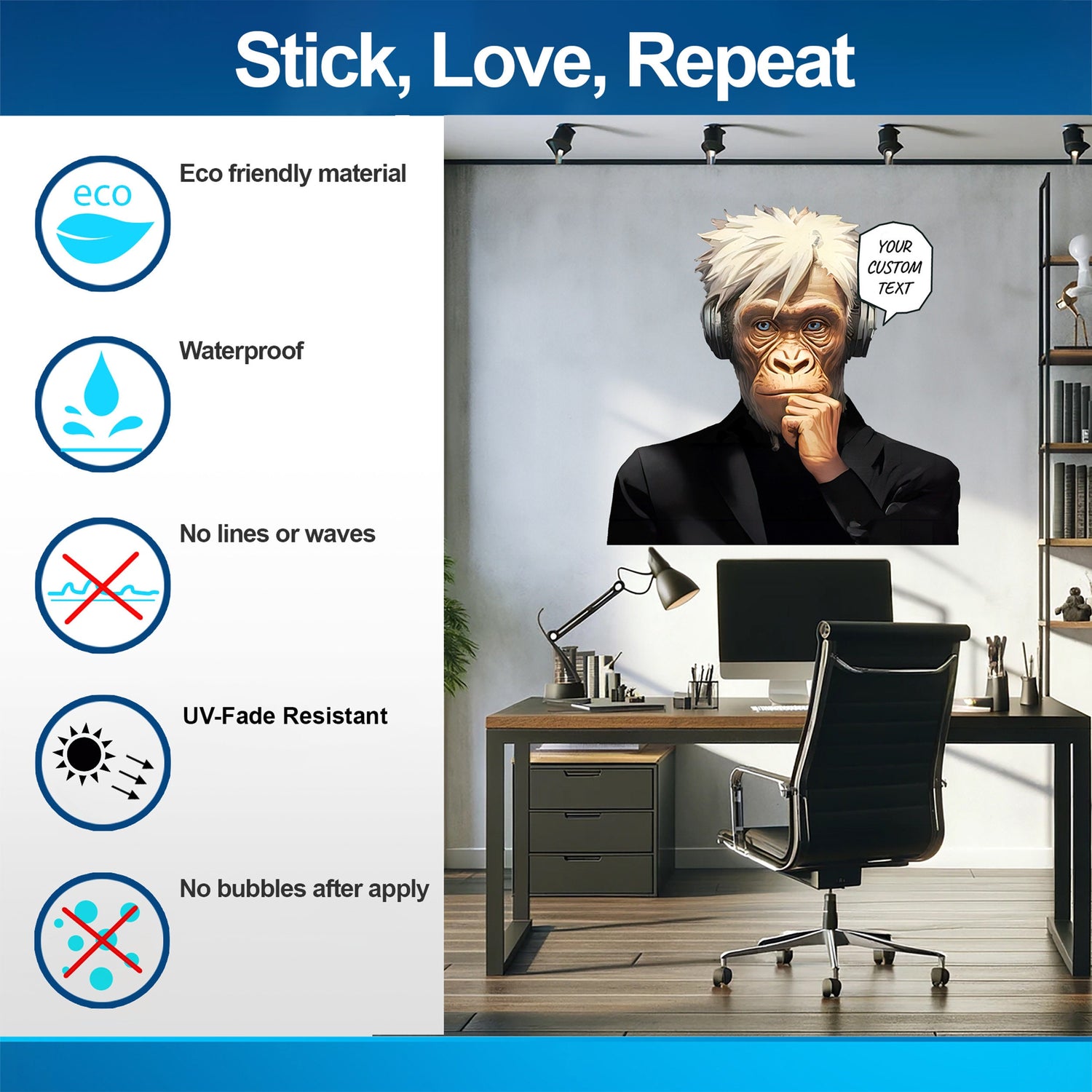 Werten Sie Ihren Raum mit dem einzigartigen Charme unseres Wise Thinking Monkey-Aufklebers auf, einem fesselnden Wandaufkleber, der Kunst, Musik und eine Prise Intellekt vereint. Mit einem nachdenklichen Schimpansen in einem eleganten schwarzen Anzug und mit Kopfhörern bringt dieses Design eine verspielte und doch zum Nachdenken anregende Atmosphäre in jeden Raum.