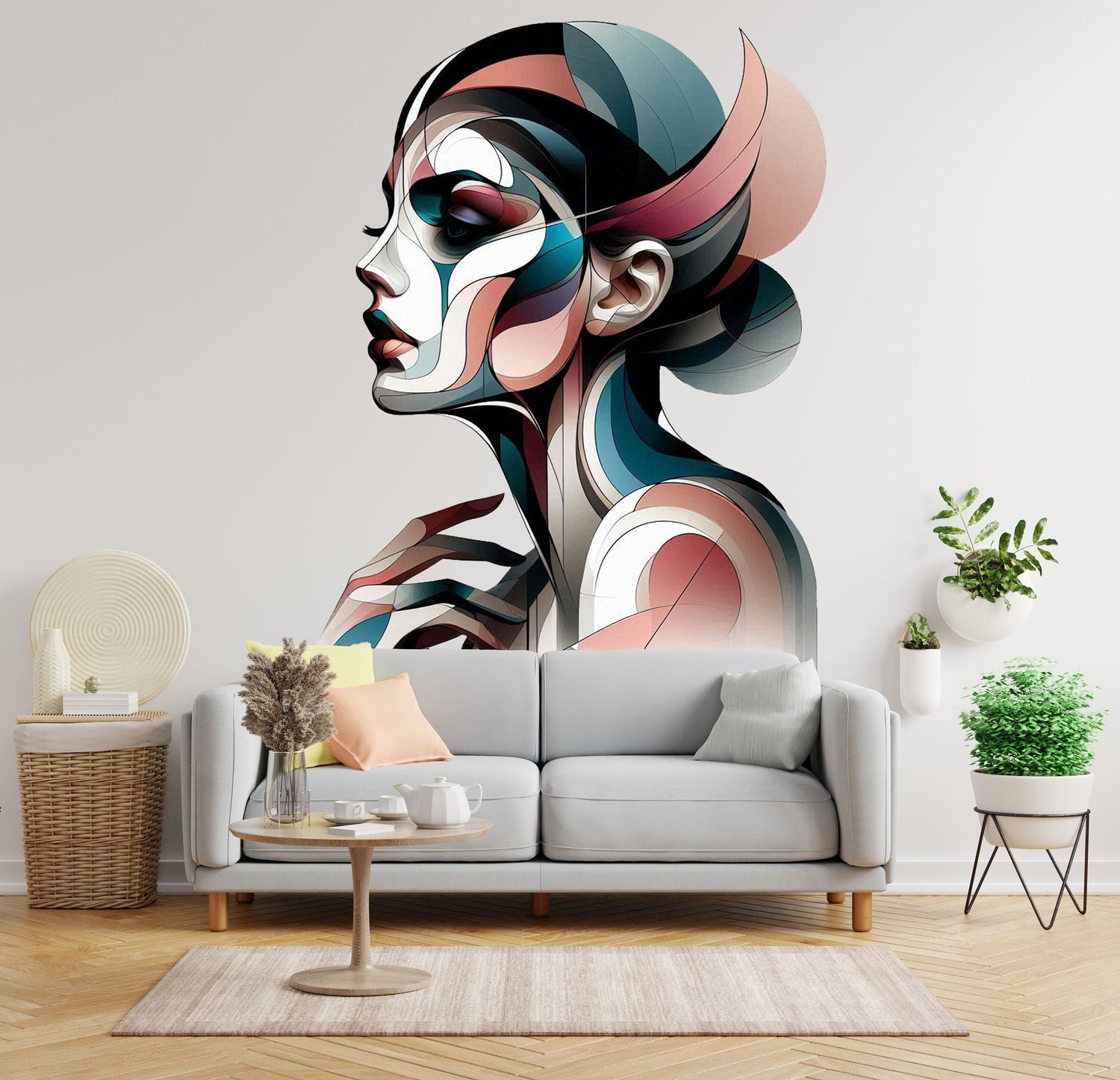 „Möchten Sie Ihrem Wohnraum einen Hauch von Eleganz und moderner Raffinesse verleihen? Stellen Sie sich das Gefühl von Stolz und Freude vor, das Sie jedes Mal verspüren werden, wenn Sie einen Raum betreten, der mit unserem Art-Deco-Wandaufkleber „Abstrakte Frau“ geschmückt ist. Dieser atemberaubende, moderne geometrische Aufkleber mit dem Profil einer Frau ist mehr als nur ein Dekorationsstück; er ist ein Stil-Statement und ein Spiegelbild Ihres einzigartigen Geschmacks.