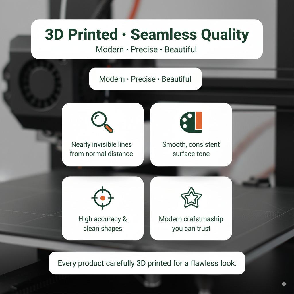 3D-prinditud tootena võivad lähedalt vaadates olla näha väga peened kihijooned, mis lisavad tootele autentset käsitöölist iseloomu. Tavapärasest vaatekaugusest näeb see välja täpselt sama, mis pildil – elegantne ja veatu. Taim ei kuulu komplekti.
