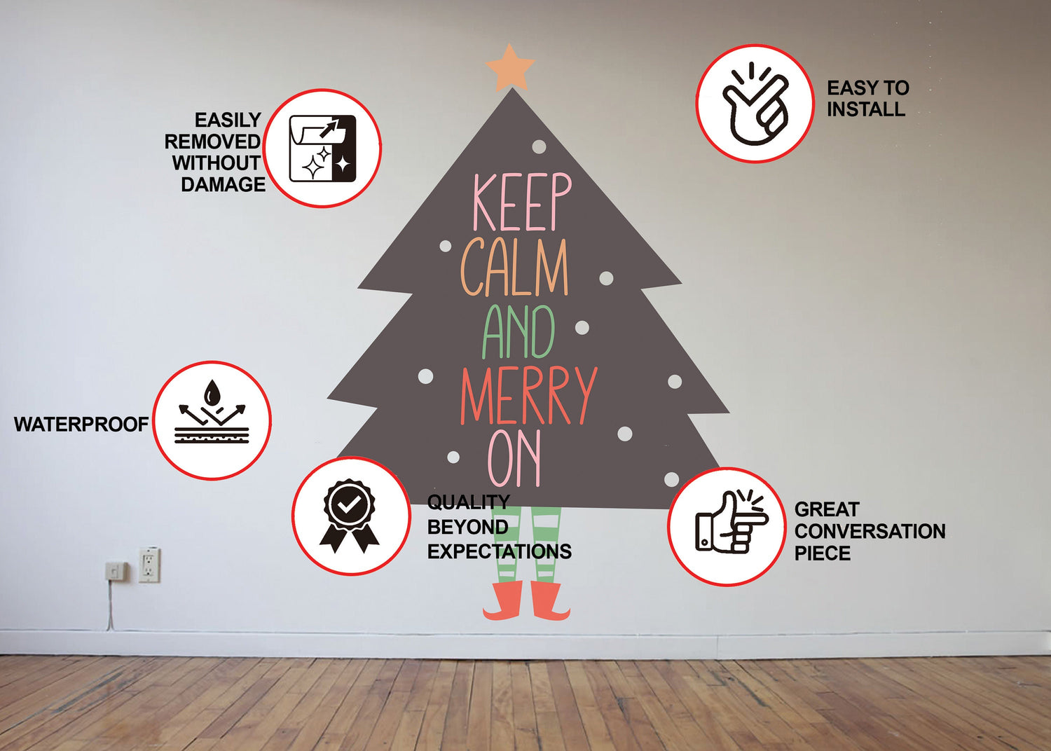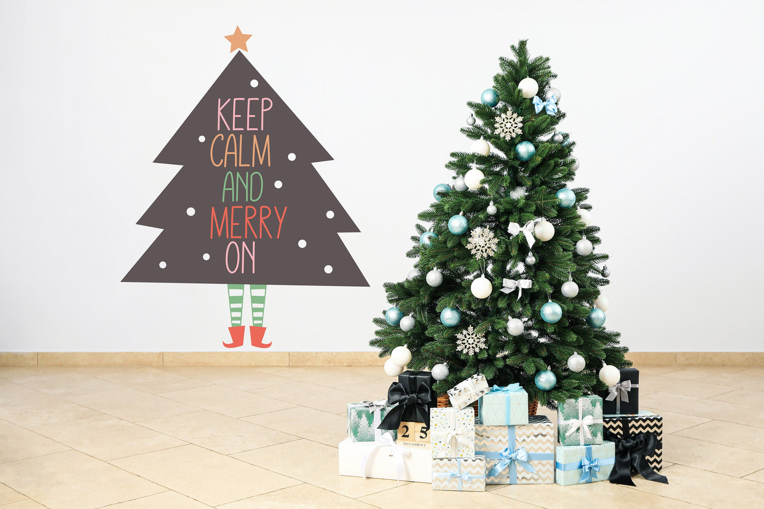 Treten Sie ein in eine Welt voller skurriler Fröhlichkeit mit unserem lustigen Vinyl-Wandaufkleber „Weihnachtsbaum mit Beinen“, der die geistreiche Botschaft „Keep Calm and Merry On“ trägt. Dieser verspielte und farbenfrohe Textaufkleber ist perfekt, um Ihrer Wohnzimmerdekoration einen Hauch von Humor und Inspiration zu verleihen und die Weihnachtszeit noch angenehmer zu machen.