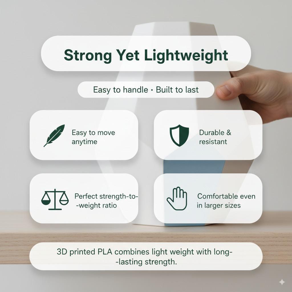 Palun pange tähele, et kõik meie tooted on valmistatud 3D-printimise tehnoloogia abil. See tähendab, et pind ei ole täiesti sile. Tavalise vaatamiskauguse tagant näib see puhas ja korras, kuid lähedalt märkate peeneid jooni või väikseid kihtide jälgi, mille on jätnud printer. Need on täiesti normaalsed ja osa 3D-printimise protsessist. Palun pidage seda meeles enne tellimuse esitamist.