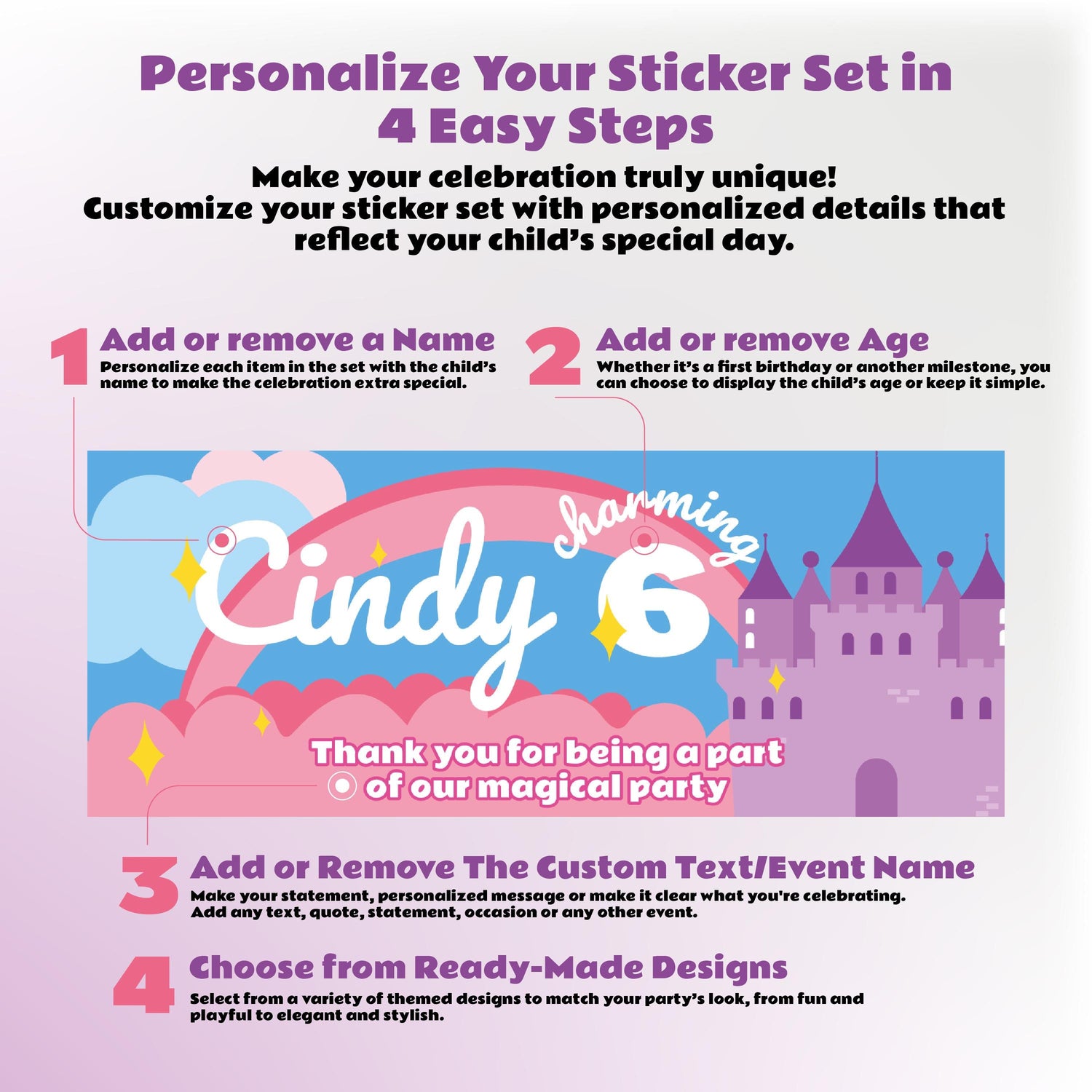 Muutke oma väikese lapse sünnipäev maagiliseks muinasjutuks meie **isikupärastatud printsesslossi sünnipäevakleebiste komplektiga**! Seda kaunist lossiteemalist kaunistust saab kohandada teie lapse nime, vanuse ja ainulaadse sõnumiga, muutes selle lummavaks lisandiks igale printsessiteemalisele pidustusele. See kleebistekomplekt, mis sobib ideaalselt peoruumide, fotokabiini taustade või magamistoa seinte kaunistamiseks, loob teie lapse eriliseks päevaks meeldejääva ja isikupärase atmosfääri.