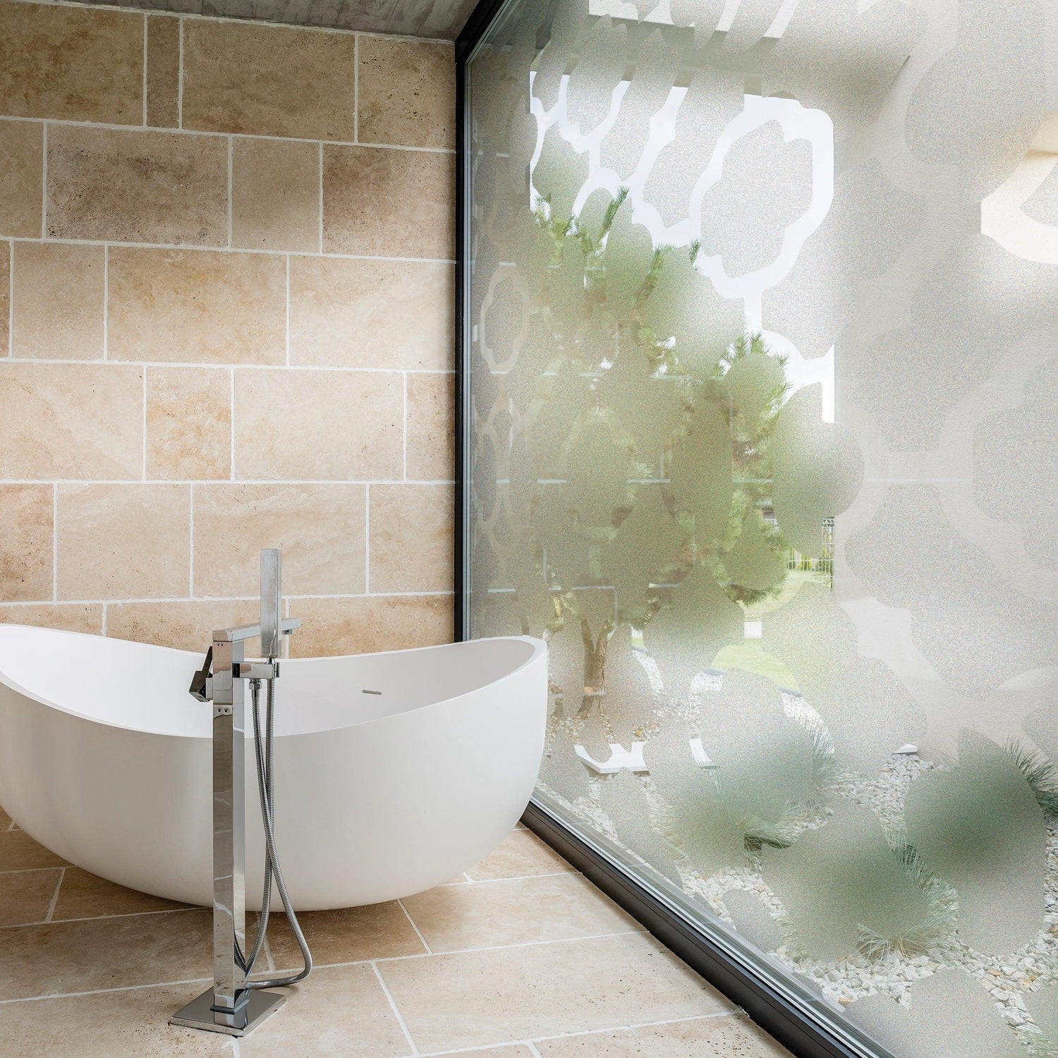 Stylish frosted window film design featuring geometric patterns, enhancing privacy while allowing natural light.