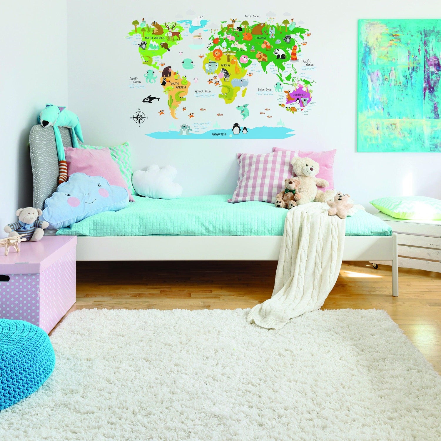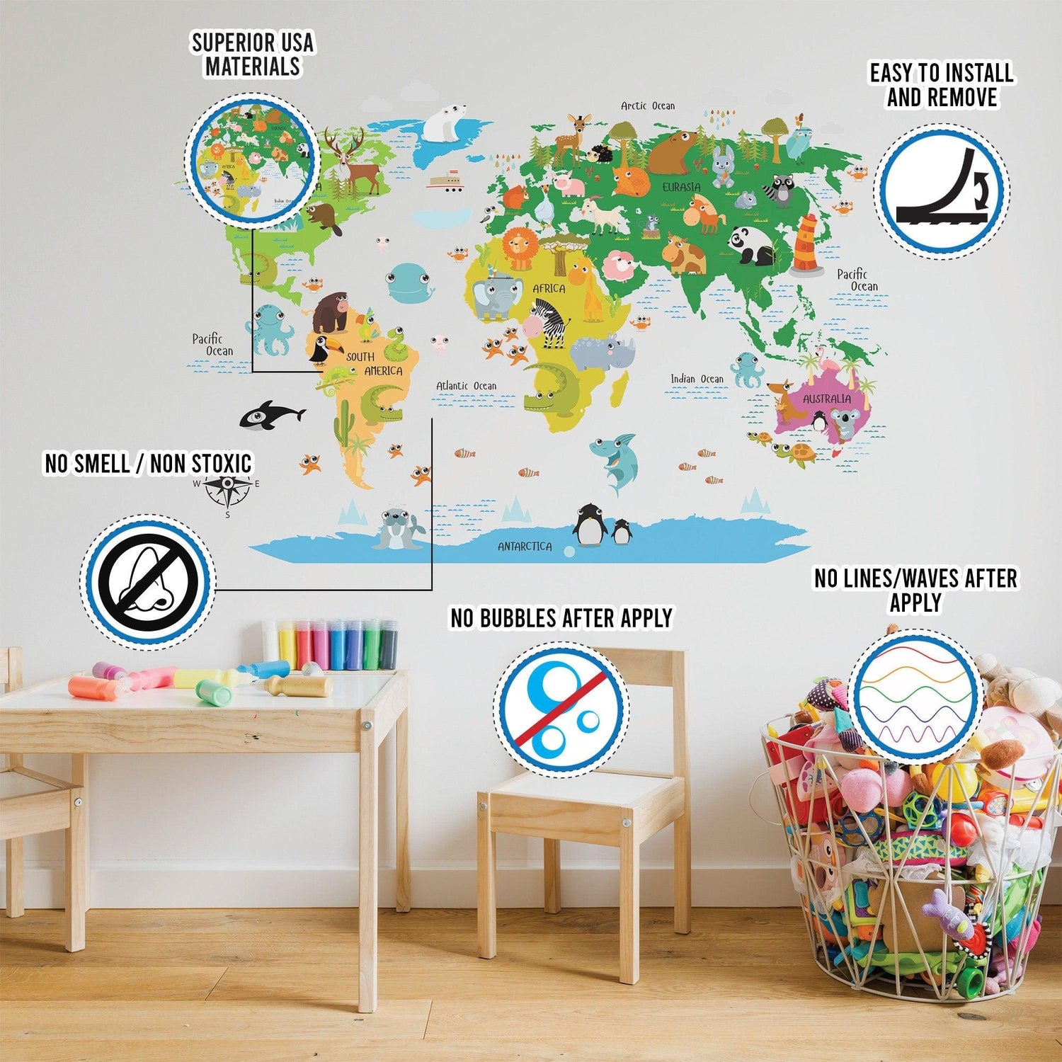 Kids World Map Wall Decal - Country Animal Room Decor Vinyl Sticker For Nursery