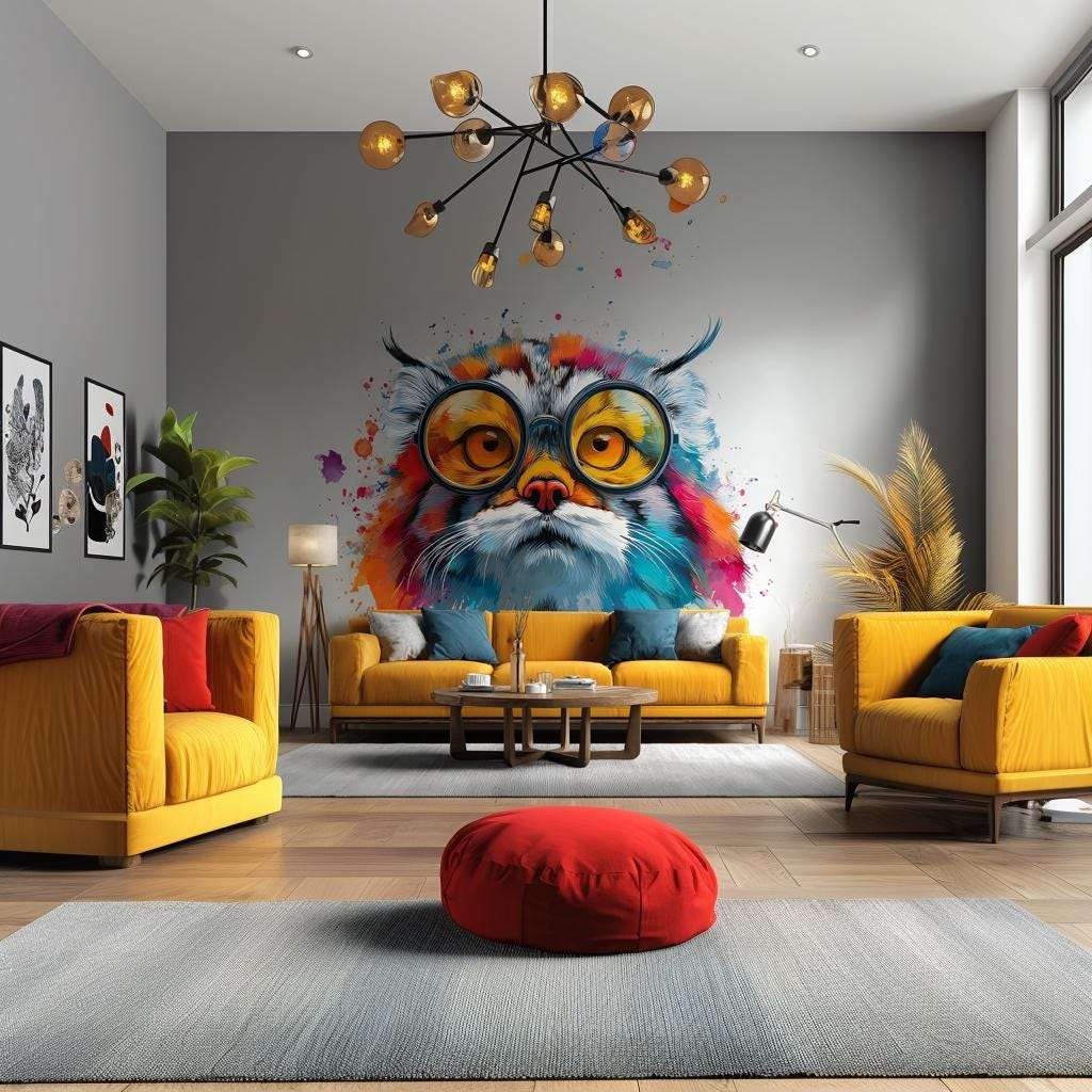 Wall decal of a Pallas’s cat (manul) wearing round sunglasses with vibrant orange lenses, surrounded by colorful paint splashes. The decal is applied to a smooth wall behind a mustard yellow sofa in a modern living room.