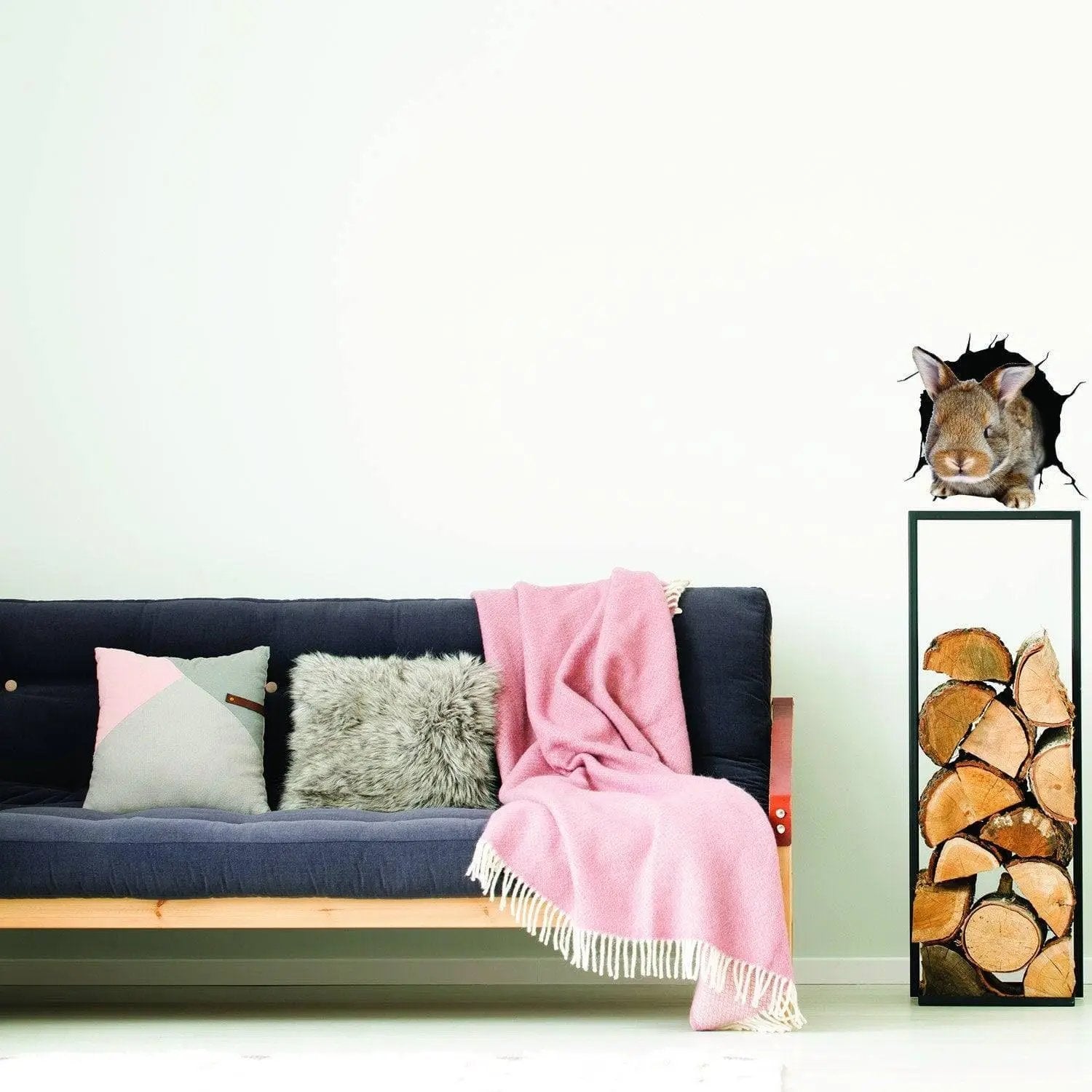 3D rabbit wall sticker design peeking through a wall, adding whimsy to kids room decor.
