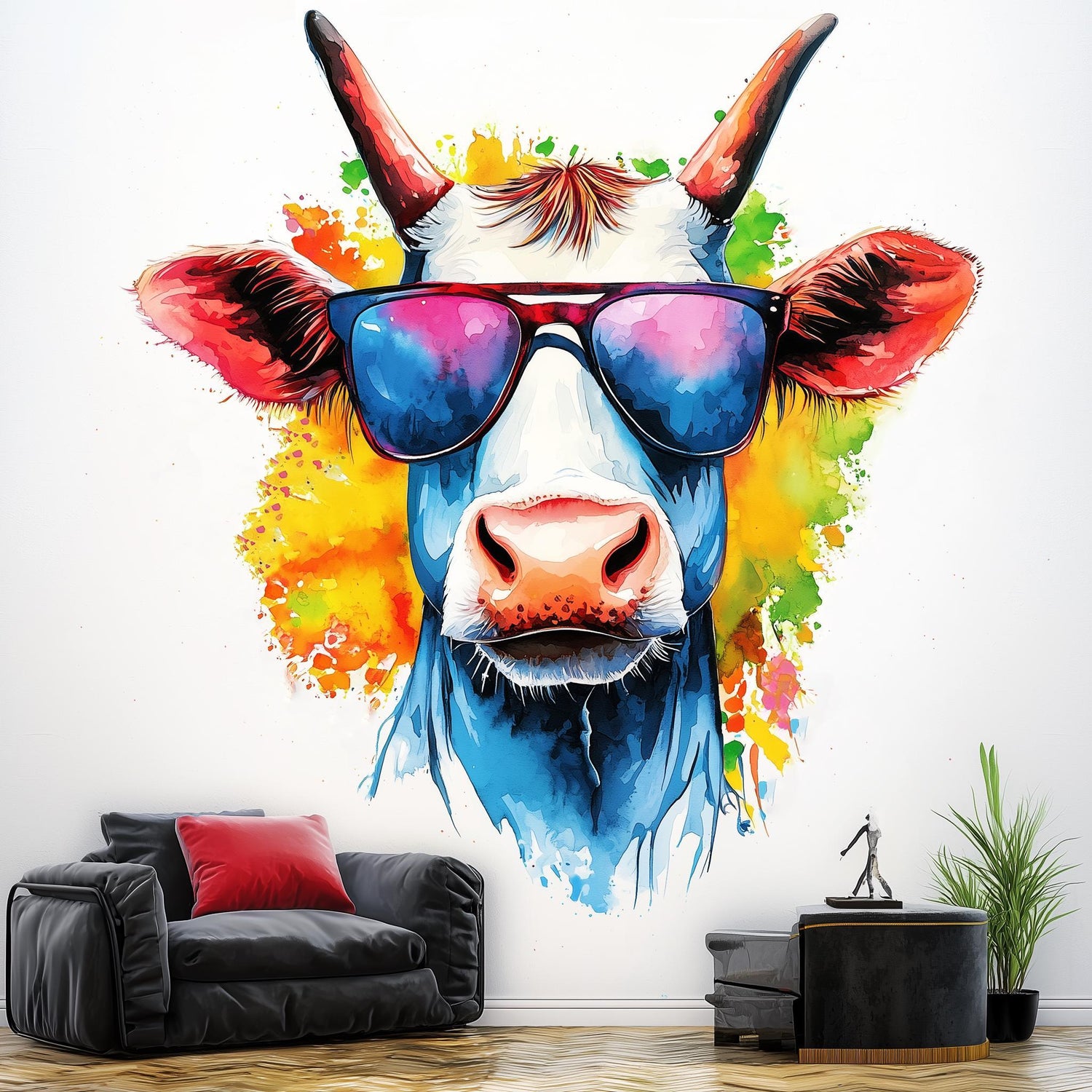 Cool Cow with Sunglasses Wall Decal | Colorful Watercolor Splash Art Sticker | Fun Kids Room Decor | Photorealistic Animal Wall Decals