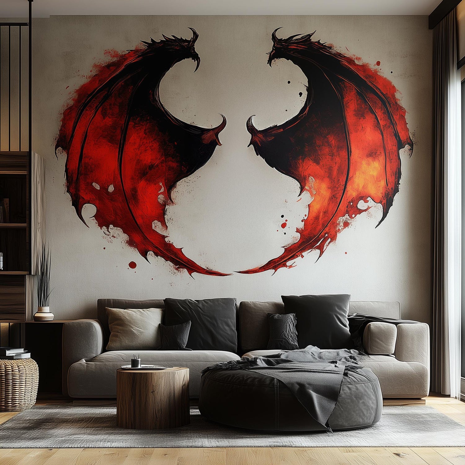 Dragon wing wall sticker in fiery red and black, creating a dramatic mural for living rooms and game rooms.
