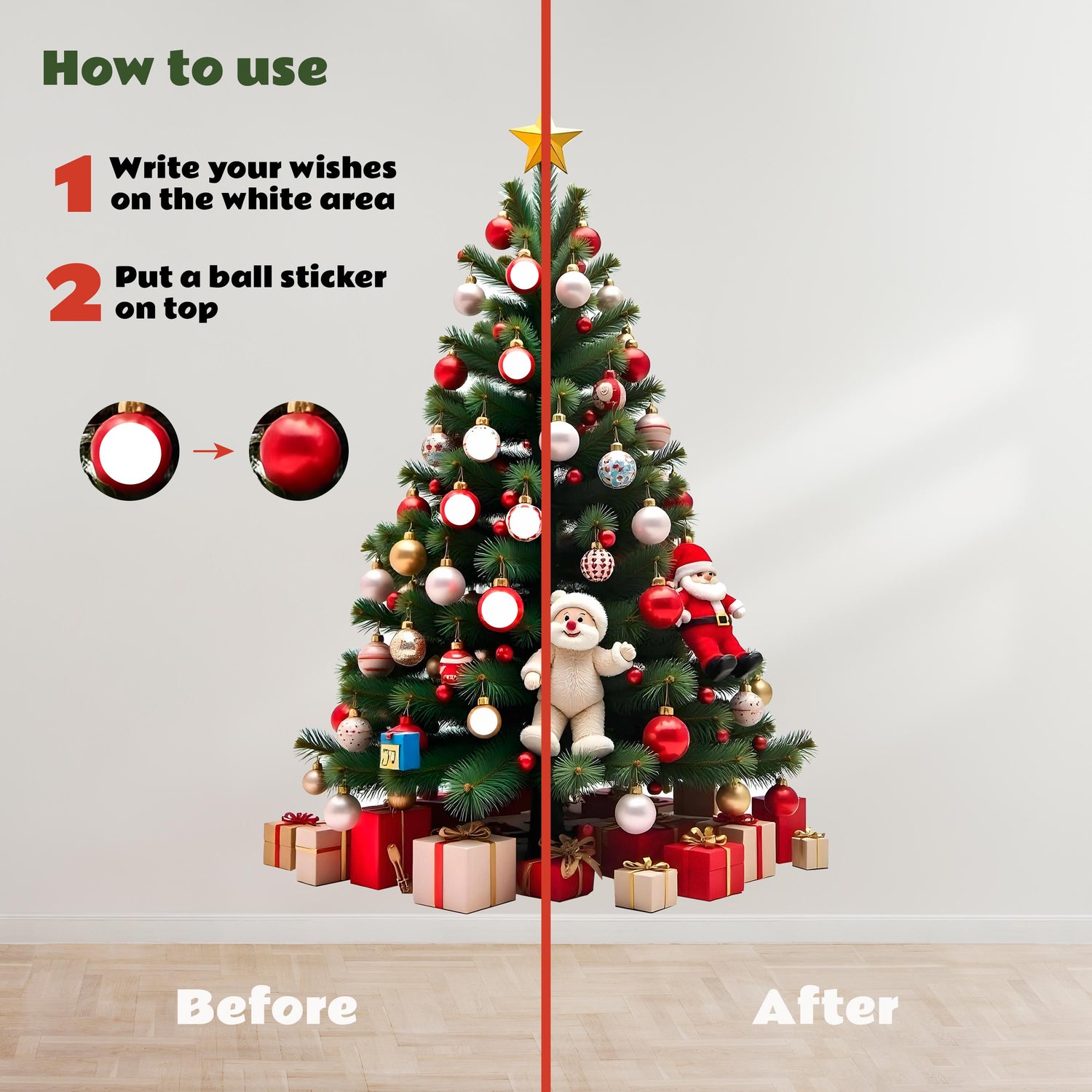 1. **Write Your Wishes**: The decal includes white ornament areas where you can write holiday wishes, personal messages, or family names. It's a wonderful way to personalize the tree and share warm holiday greetings.