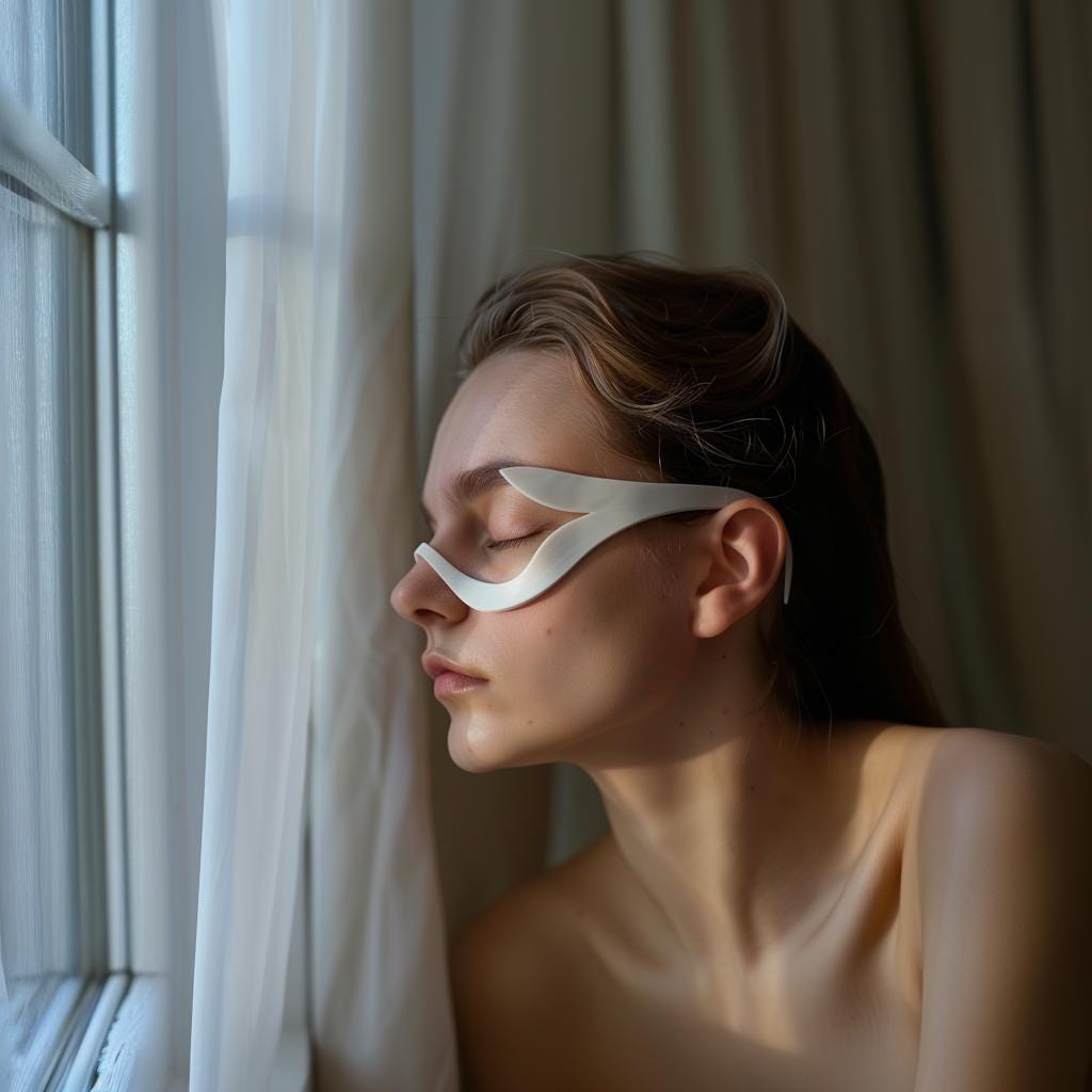 Side view of an adult wearing a minimalist white 3D printed visor-style mask glasses, sculptural band around the eyes and nose, in soft natural light.