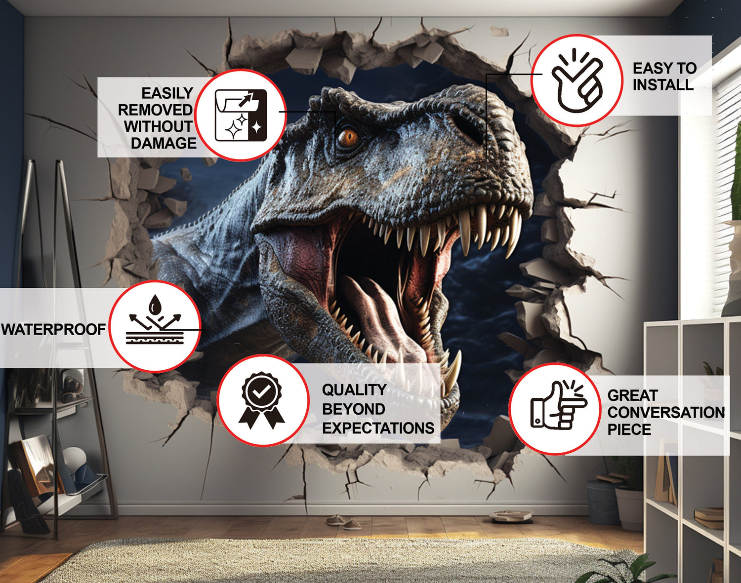 Our wall sticker features of dinosaur with a captivating broken wall illusion effect, making it appear as if this majestic creature are popping out from the wall, right into his room! It's not just a wall decor, it's a porthole into a world that your child loves.