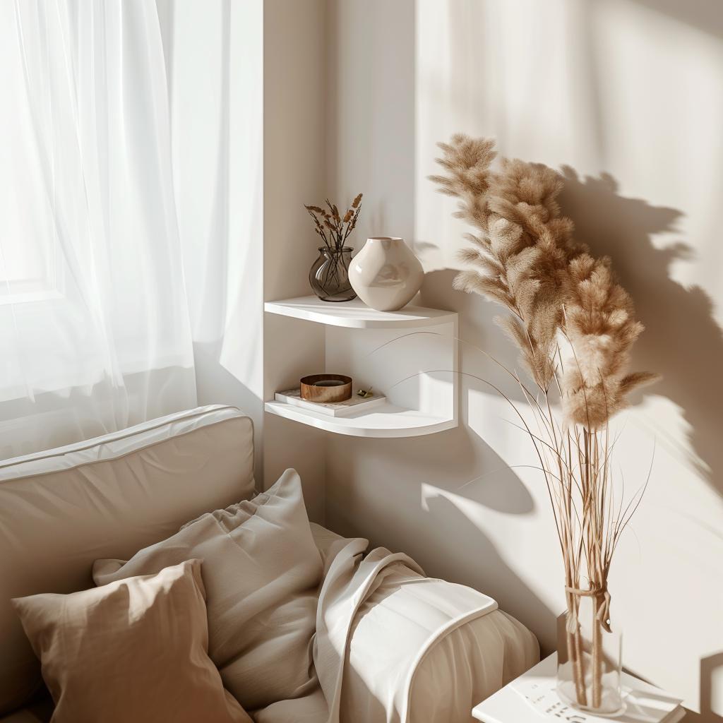 3D printed corner wall shelf in matte white PLA, mounted above a sofa with natural light and dried flowers, minimalist modern home decor accessory