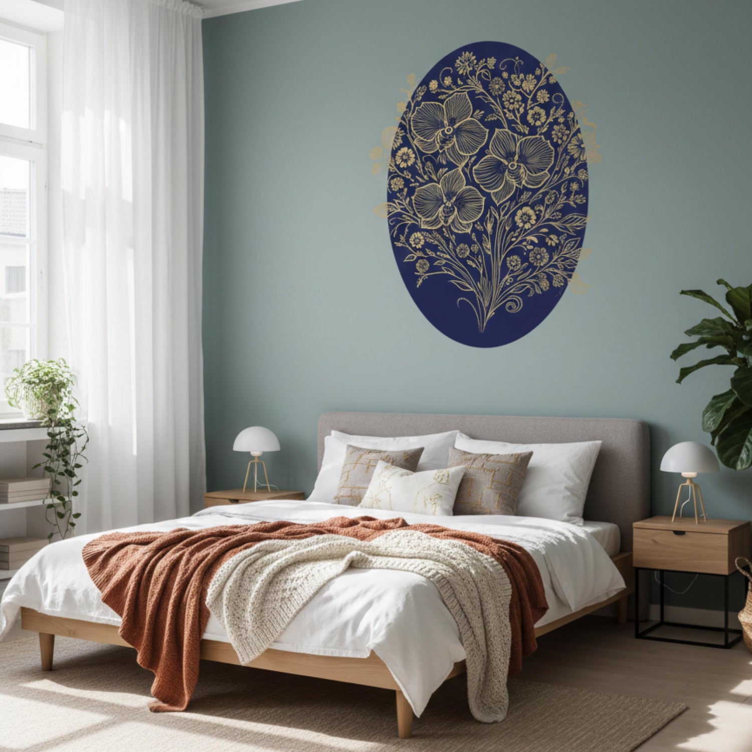 Gold Filigree Orchid Decal | Navy Blue Floral Mural