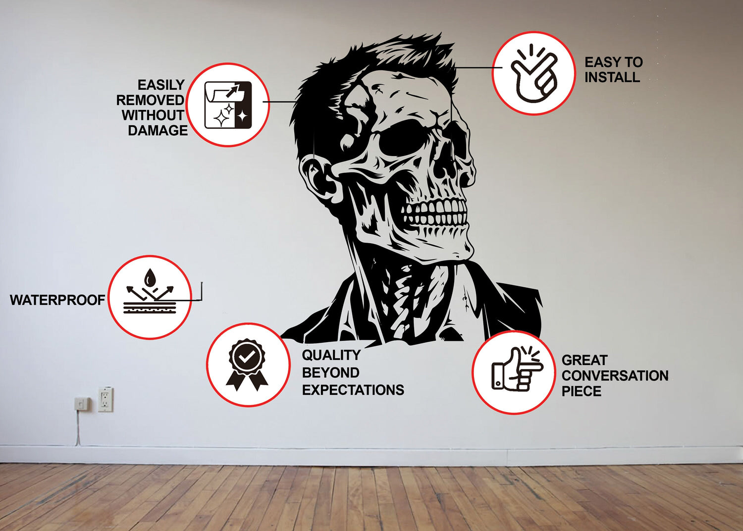 Our decal is a perfect intersection of traditional Halloween aesthetics and modern design. Whether it's for your office, living room, or even a barbershop, this cranium silhouette mural brings both chills and chuckles. Made with high-quality vinyl, it's not only easy to apply but also durable, promising to stay pristine for the entirety of the spooky season.