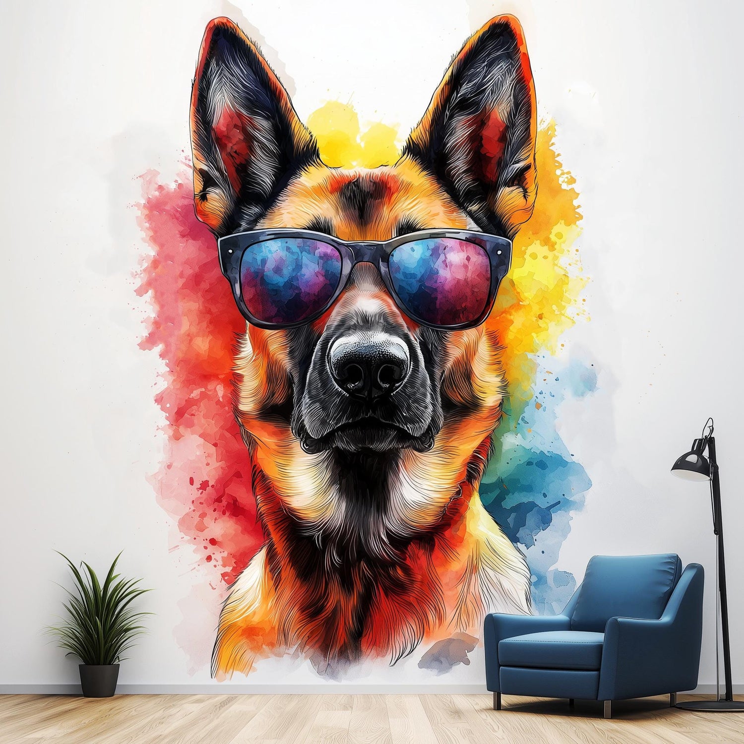 Photorealistic German Shepherd Wall Sticker | Cool Dog Decal with Sunglasses | Colorful Dogs Wall Art | Playful Pet Decor Vibrant Wall Decal