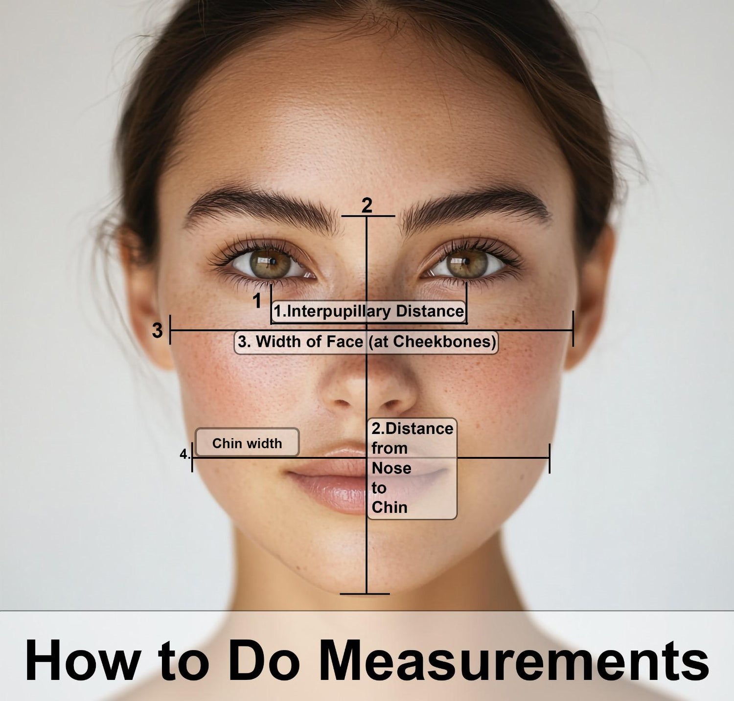 To ensure a perfect fit, please measure carefully using a straight ruler (not a flexible tape) in front of a mirror. All measurements must be taken in a straight line, not following the curve of your face.
