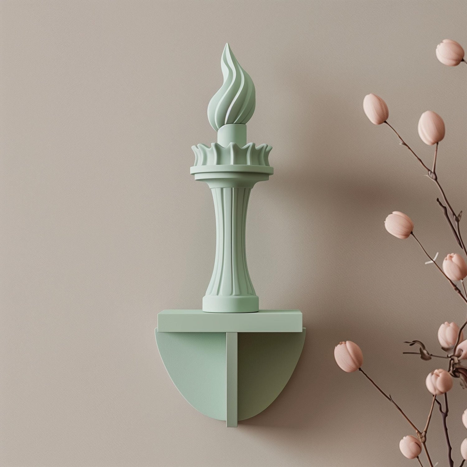 3D printed wall decor shaped like the Statue of Liberty torch, minimalist modern sculpture made of matte PLA plastic mounted on a neutral wall.