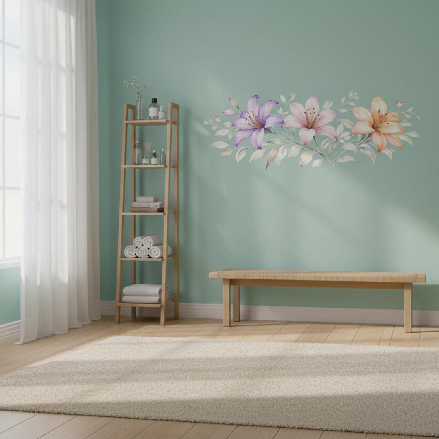 Add a blooming touch of elegance to your wide open spaces. This horizontal watercolor illustration features a graceful row of lilies in soft lavender, blush pink, and warm apricot. Surrounded by delicate silvery-green foliage, this panoramic arrangement is the perfect choice for creating a serene floral focal point above furniture or along a wall.