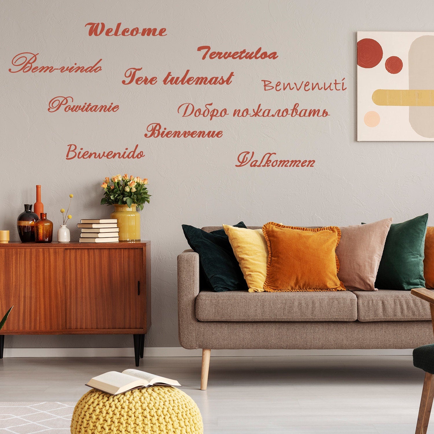 Tervitage oma külalisi stiilselt meie tervitusvinüülist seinakleebistega. See ainulaadne toode sobib suurepäraselt teie välisuksele isikupära lisamiseks. Kvaliteetsest vinüülist valmistatud kleebised on vastupidavad ja kergesti paigaldatavad. Elegantne font ja keerukas disain muudavad selle kleebise silmapaistvaks ja lisavad teie kodule rafineeritust. Parim osa? See on täielikult kohandatav! Valige erinevate värvide ja suuruste hulgast, mis sobivad teie kodu sisekujundusega. Ükskõik, kas soovite lisada sooja tervituse või lihtsalt oma välisukse sildistada, on meie tervitusvinüülist seinakleebised ideaalne valik. Uuendage oma kodu sissepääsu selle ainulaadse tootega juba täna!