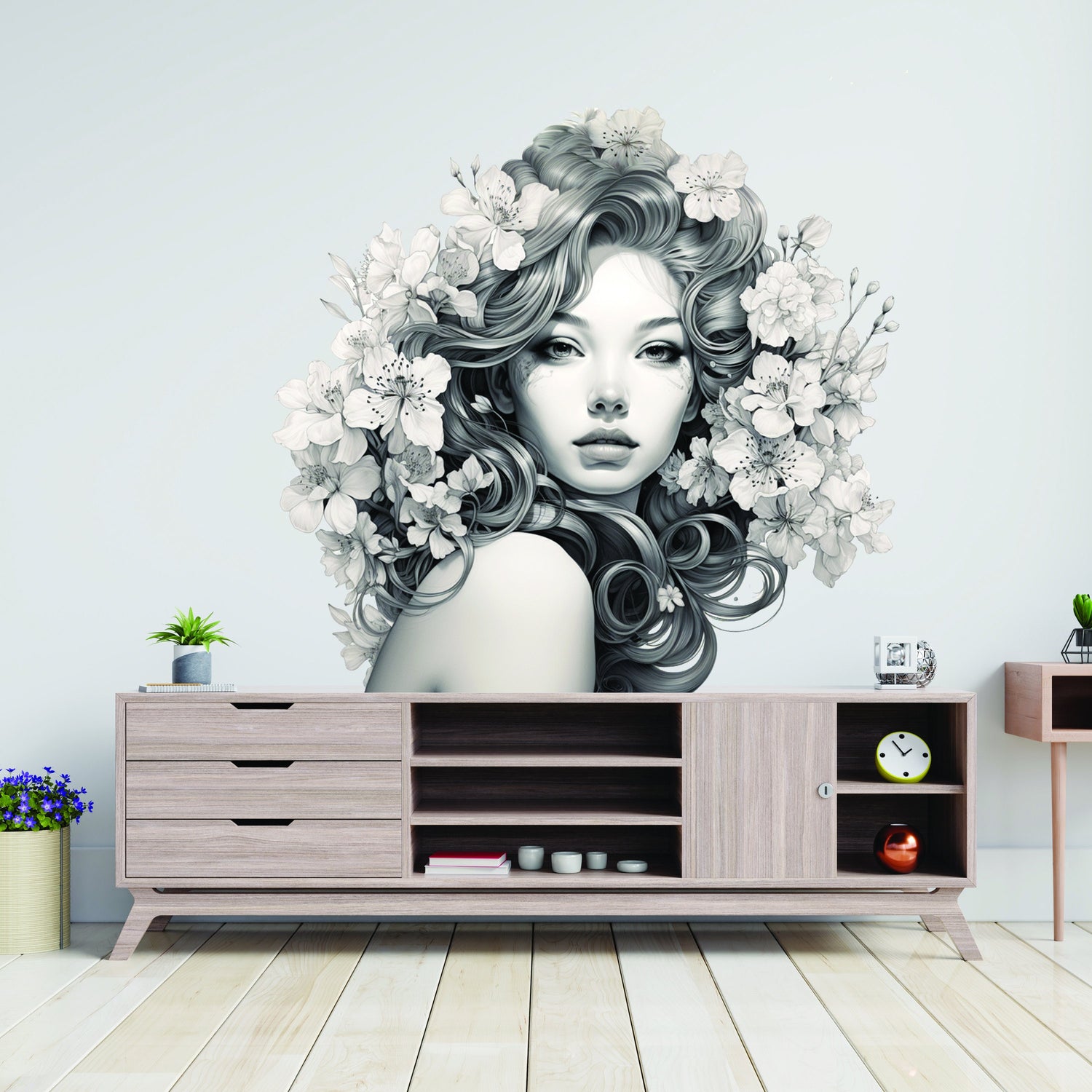 Elegantne lillelise meelekleebisega naine – korterisõbralik vinüülist seinakunsti kleebis