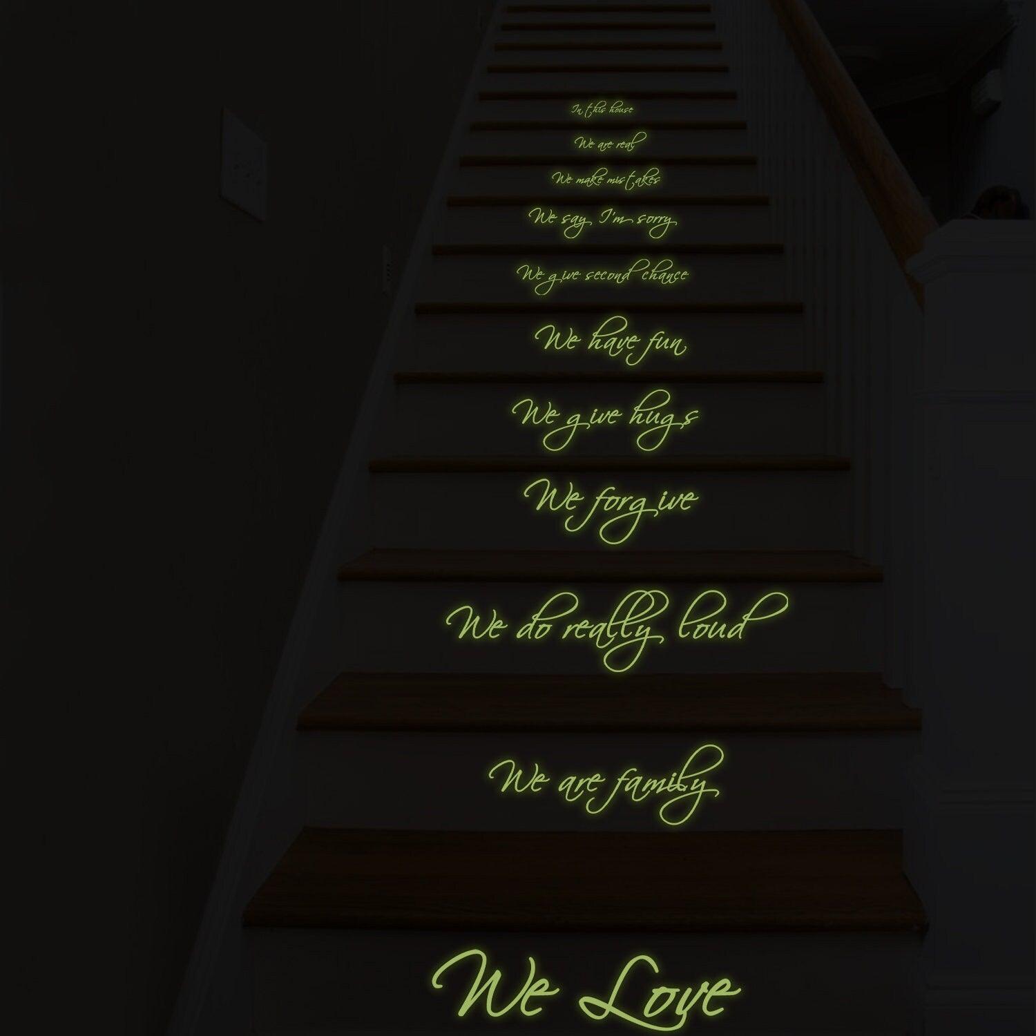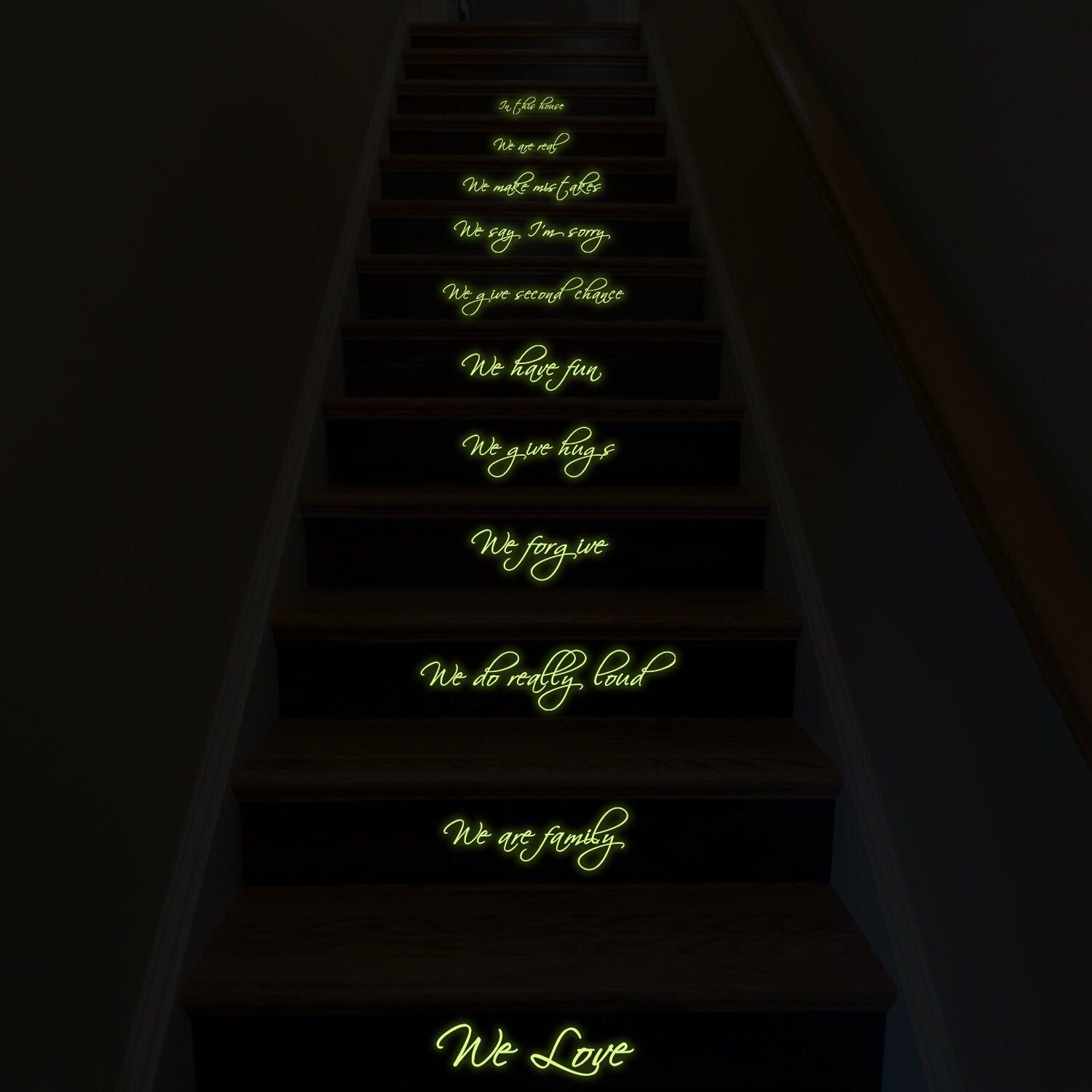 Glow in dark quote stair sticker featuring family values like love, fun, and second chances on a staircase.